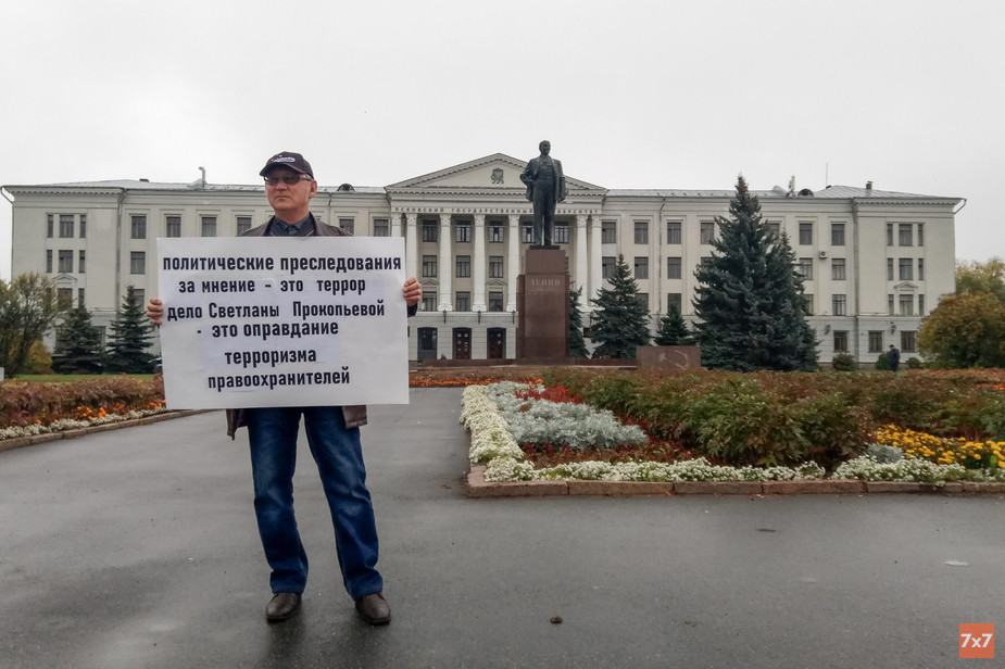 Один из пикетчиков, руководитель движения «Свободный берег» и эко-активист Игорь Батов, развернул плакат «Политическое преследование за мнение - это террор. Дело Светланы Прокопьевой - это оправдание терроризма правоохранителей, Не путайте мнение журналиста с бумажным стаканчиком». Он рассказал корреспонденту «7х7», что вышел на акцию, потому что его «достал криминал» правоохранительных органов, которые «навяливают» политические дела: