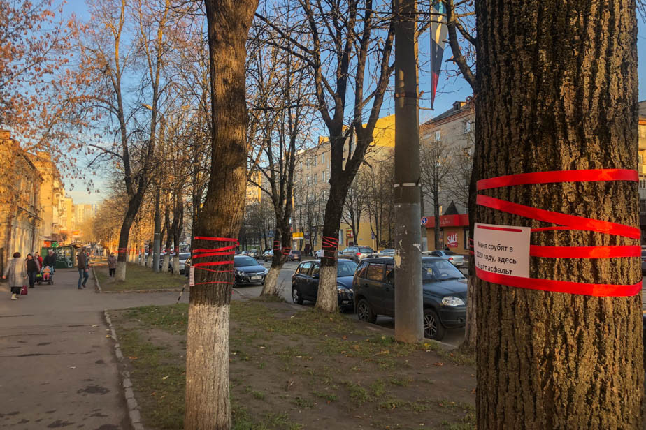 — Мы взяли план улицы из проекта и строго в соответствии с ним пометили деревья красной лентой. И сразу стало видно, насколько все будет грустно. Мы добавили таблички от имени деревьев, какую пользу они тут приносили — сколько пыли и тяжелых металлов поглощали, насколько в жару снижали температуру и т. д. Люди подходили и не верили, что это правда, особенно мамы из яслей переживали, у которых прямо под окнами окажется заездной карман и паркинг, — рассказала «7х7» Ирина Ефимова.