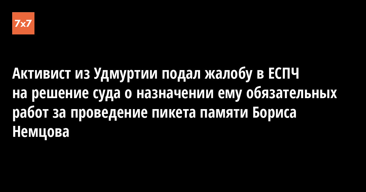 Активист из Удмуртии Сергей Урбан подал жалобу в ЕСПЧ на решение Индустриального районного суда Ижевска назначить ему 40 часов обязательных работ за пикет памяти убитого политика Бориса Немцова. Об этом 22 октября сообщил портал "МБХ Медиа" со ссылкой на юриста «Правозащиты Открытки» Эльзу Нисанбекову.