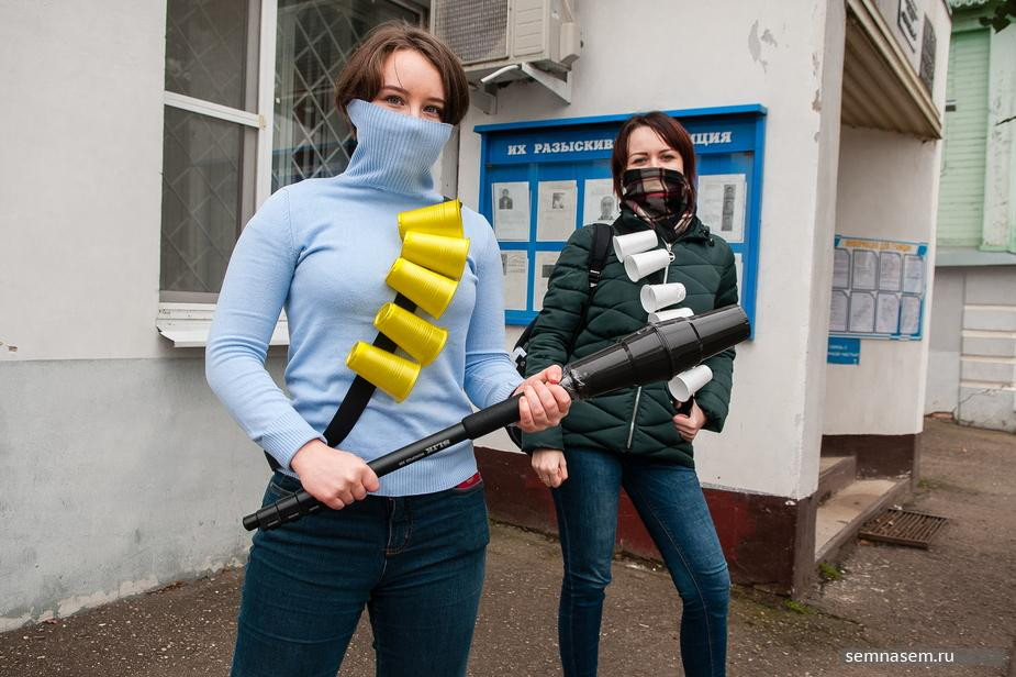 Во время акции 29 сентября девушки устроили фотосессию у отделения полиции со стилизованными патронташными лентами и «гранатометом» из пластиковых стаканчиков, а у общественной приемной председателя партии «Единая Россия» Дмитрия Медведева провели флешмоб в футболках с кровавыми подтеками, заклеенными красным скотчем ртами и наручниками. Они держали в руках табличку «Она была против Путина».