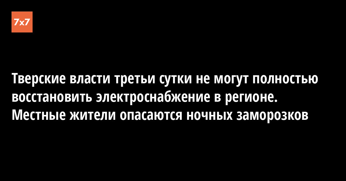 Пресс-служба опубликовала релиз, в котором утверждается, что устранением последствий занимаются около тысячи специалистов, в том числе привлеченных из Москвы. На вопрос корреспондента «7x7», какое количество населенных пунктов в Твери остается без света и когда закончится ликвидация, в пресс-службе правительства ответить не смогли и предложили направить официальный запрос. Назвать точное количество населенных пунктов не смогли и в Управлении МЧС по Тверской области.