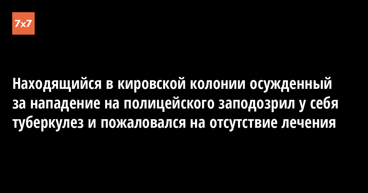 Электрик из Шарьи Костромской области Вячеслав Шатровский, находящийся в кировской колонии за нападение на полицейского в день «революции» видеоблогера Вячеслава Мальцева, пожаловался, что его не лечат от пневмонии или туберкулеза. Об этом 30 октября сообщило «ОВД-Инфо» со ссылкой на адвоката Константина Маркина.