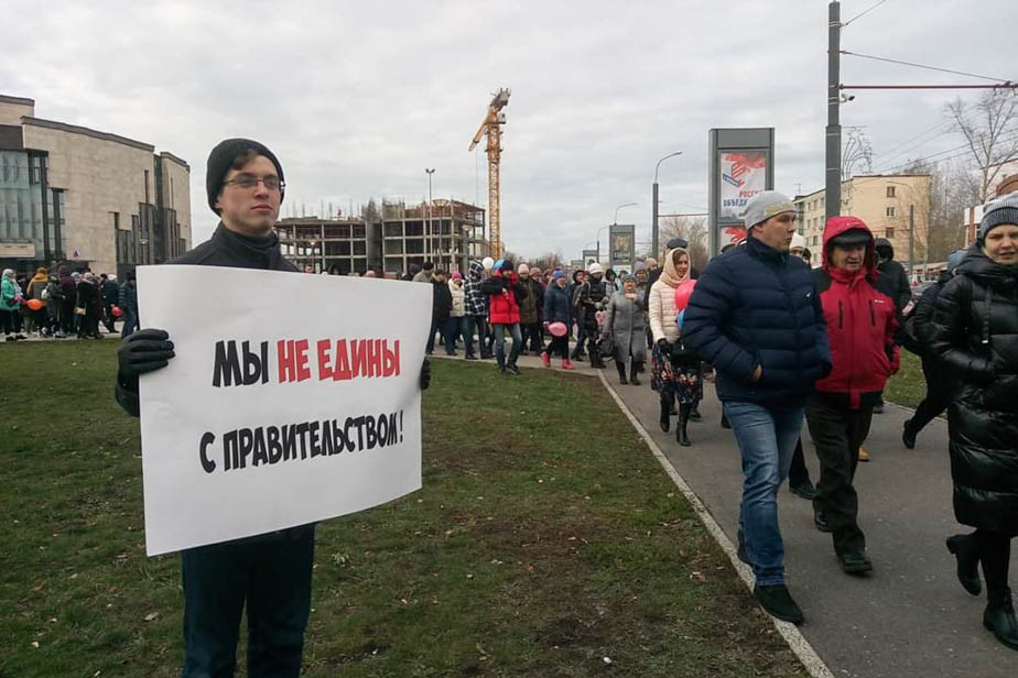 Они держали в руках плакаты с надписями «Мы не едины с правительством», «Олигархи — не наш народ!», «День народного единства против народа?», «Один, но не сломлен. Русский, проснись!»