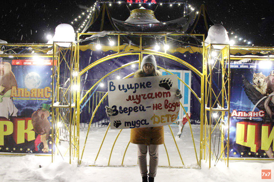 Организовала серию пикетов активистка Евгения Аглоткова. Она и еще четверо зоозащитниц в сильный мороз вышли на улицы города с плакатами, призывающими запретить использование животных в цирке.