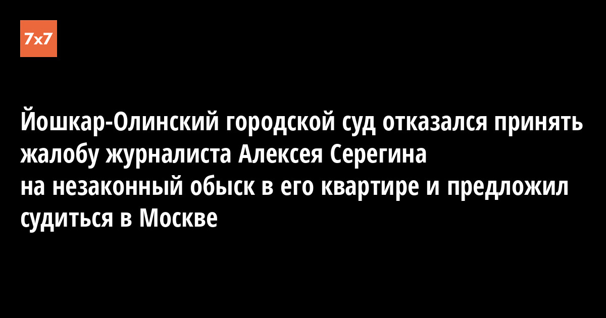 Городской суд Йошкар-Олы отказался принять жалобу журналиста Алексея Серегина на незаконный обыск и решил, что жалобу журналиста должен рассмотреть Басманный суд Москвы, сообщил Серегин «7х7» 27 ноября. Журналист обжалует отказ в Верховном суде Марий Эл.
