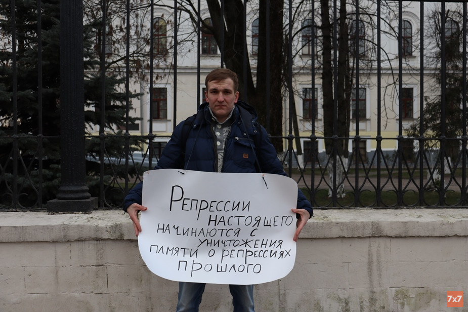 В одиночном пикете по очереди участвовали двое активистов. Они передавали друг другу плакат с надписью «Репрессии настоящего начинаются с уничтожения памяти о репрессиях прошлого». В общей сложности пикет длился три часа.