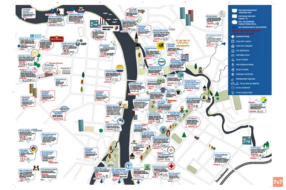 - На карте можно локализовать организации в городе, с помощью простой визуализации кратко и емко обозначить, какой группе они помогают, какую проблему решают, чем занимаются, как можно их поддержать и принять участие в работе. Предполагалось, что на обороте карты будет дана подробная информация о каждой из организаций, но места хватило только на контакты и короткое перечисление направлений работы. Мне кажется, что наш проект вызвал интерес у других НКО и инициатив, на презентацию пришло более половины участников карты, многие сейчас звонят или пишут, чтобы узнать, где они могут забрать свои экземпляры.