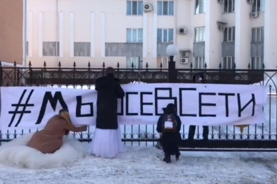 Баннер с хештегом #МыВсеВСети повесили на забор Пензенского областного суда 8 февраля – за двое суток до начала оглашения приговора по делу «Сети»*. Видеозапись с акции опубликована в Telegram-канале «СВОБОДУ РОССИИ».
