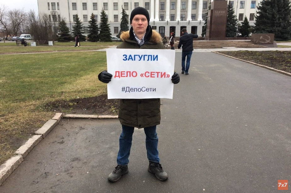 Владимир Жилинский отметил, что активисты два часа поочередно стояли с плакатами. На них было написано: «Решение по делу „Сети“* сфабрикованное и людоедское», «Загугли дело „Сети“*», «Дело „Сети“* — дело о пятах», «Государство - главный террорист! Доступ к лечению / свободу Илье Романову», «Свободу политзаключенным / #свободумилушкиным» и так далее. Он добавил, что акция прошла спокойно, но под конец полиция, по его мнению, спровоцировала конфликт: