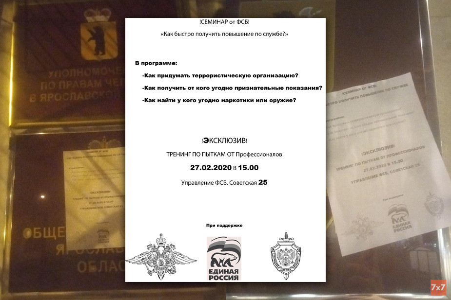 Алан Ерох расклеила листовки с придуманным ею пародийным текстом «Эксклюзив! Тренинг по пыткам от профессионалов: 27.02.2020 в 15:00, Управление ФСБ, Советская, 25», оформленные как реклама семинара, на зданиях правительства Ярославской области, общественной палаты Ярославля, Ярославской областной думы, корпуса университетов ЯГПУ и ЯрГУ, Аппарата уполномоченного по правам человека и других зданиях.