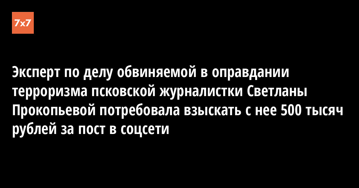 Эксперт-психолог из Абакана (Хакасия) Ольга Якоцуц подала иск к обвиняемой в оправдании терроризма псковскому журналисту Светлане Прокопьевой с требованием удалить порочащий деловую репутацию эксперта пост в Facebook и взыскать 500 тыс. руб. моральной компенсации. Об этом корреспонденту «7х7» рассказала 1 марта Светлана Прокопьева.