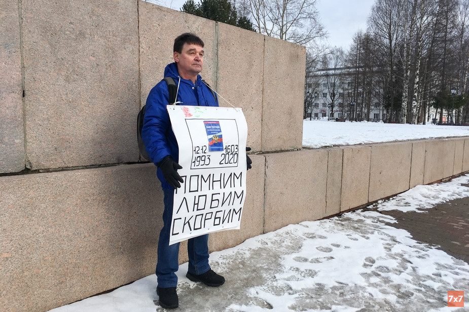 Фёдор Кобзев три часа простоял в одиночном пикете на Стефановской площади, на которой находится Госсовет Коми и администрация главы республики. В руках он держал плакат с приклеенной Конституцией, а ниже была надпись «Помним. Любим. Скорбим» и даты принятия и одобрения Госдумой новых поправок. По словам пикетчика, он вышел на площадь для того, чтобы депутаты видели, что не все люди одобряют поправки в Основной закон. Два дня назад он тоже выходил на площадь с одиночным пикетом, но с плакатом «Путину пожизненный срок».
