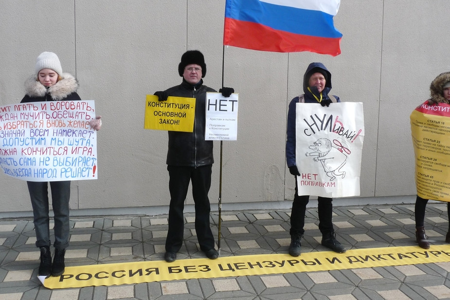 В пикете приняли участие пятеро человек. Активисты развернули плакаты с лозунгом «Россия будет свободной», «Россия без цензуры и диктатуры», «Снуливай. Нет поправкам!» и цитатами из Конституции.