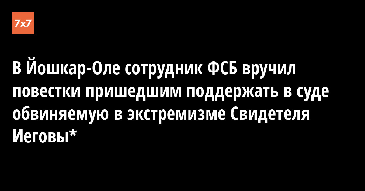 Сотрудник ФСБ пригласил по повестке на допрос шесть человек, пришедших поддержать подозреваемую в экстремизме Екатерину Пегашеву в Йошкар-Олинском городском суде. Об этом 23 марта сообщил портал «ОВД-Инфо» со ссылкой на сайт «Свидетелей Иеговы в России»*.