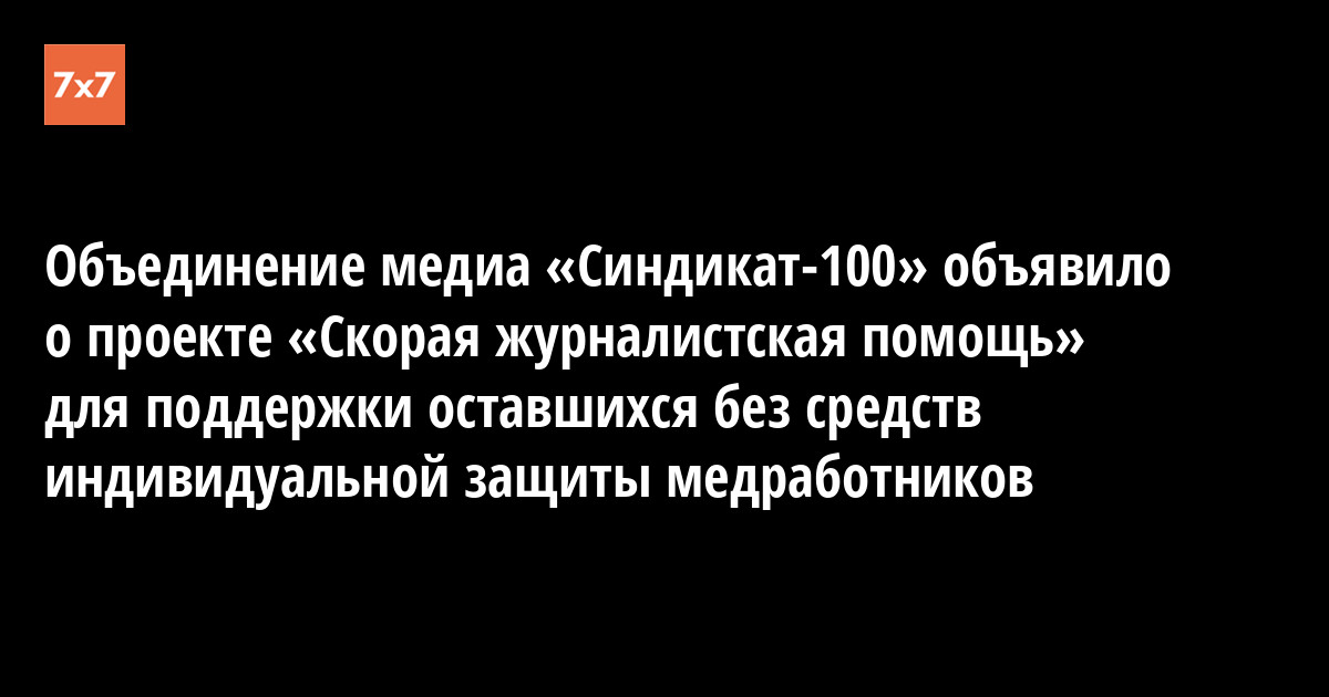 Объединение независимых медиа «Синдикат-100» вместе с журналистами-волонтерами запустили проект «Скорая журналистская помощь» для работы с сотрудниками медицинских учреждений, которые не обеспечены необходимыми средствами индивидуальной защиты от коронавируса. Проект начал работать 6 мая.