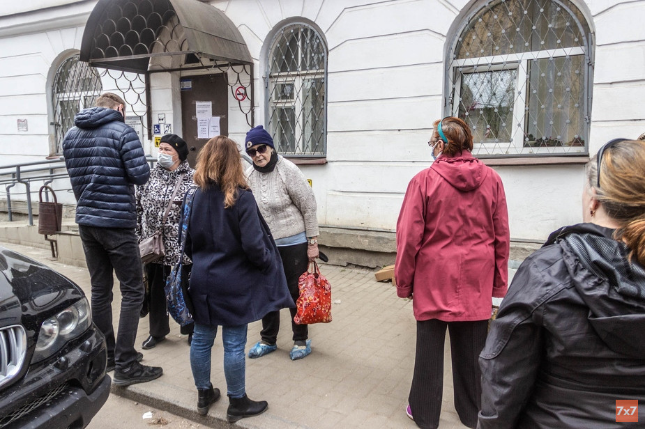 Пенсионеры в Великом Новгороде 8 мая собрались около двери центра социального обслуживания населения, чтобы получить продуктовые наборы. В течение дня количество находящихся в непосредственной близости друг от друга человек менялось от 10 до 50.