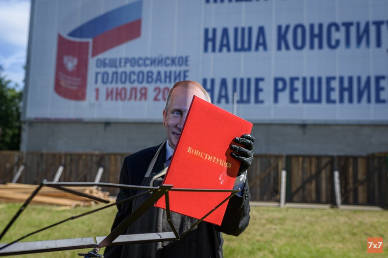 В центре Сыктывкара активисты 28 июня устроили перформанс по поправкам в Конституцию РФ. Человек в маске Путина белой смесью испачкал папку, которая изображала главный документ страны. На акции присутствовал корреспондент «7x7».
