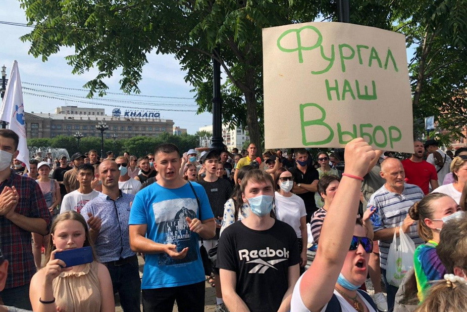 Очередная акция в защиту Сергея Фургала в Хабаровске собрала десятки тысяч человек. Первый несогласованный митинг прошел 11 июля, с тех пор шествия проходят каждый день. По оценке корреспондента «Коммерсанта», 18 июля число людей в колонне могло достигать 50 тысяч. Это самая массовая акция в современной истории Хабаровска. Поддержать Фургала вышли жители еще двух городов Дальнего Востока: Владивостока и Комсомольска-на-Амуре.