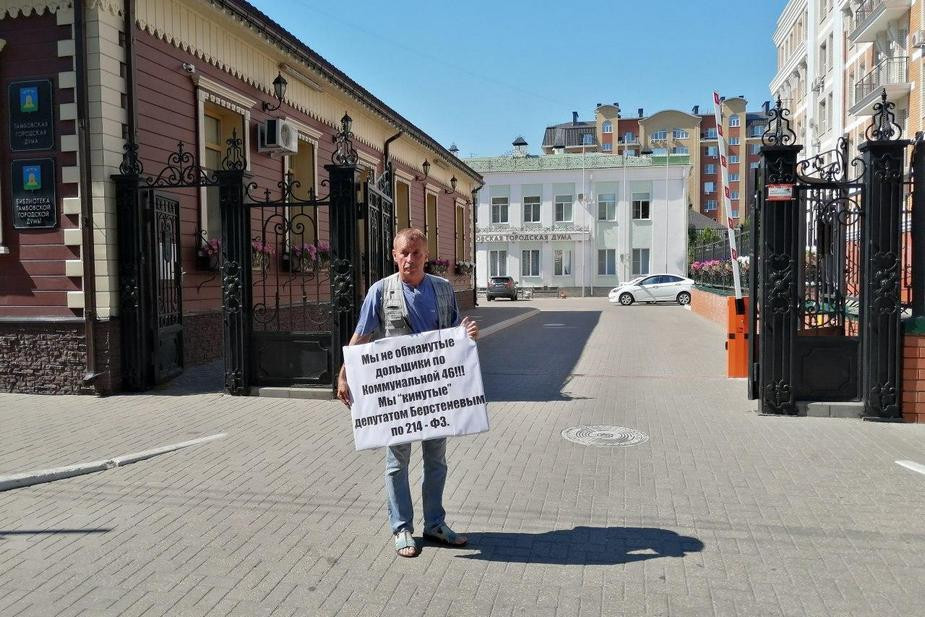 В Тамбове обманутые дольщики вышли на одиночные пикеты к зданию городской думы с требованием лишить депутата Геннадия Берстенёва («Единая Россия») звания почетного гражданина города. Об этом «7х7» рассказал активист Владимир Жилкин.