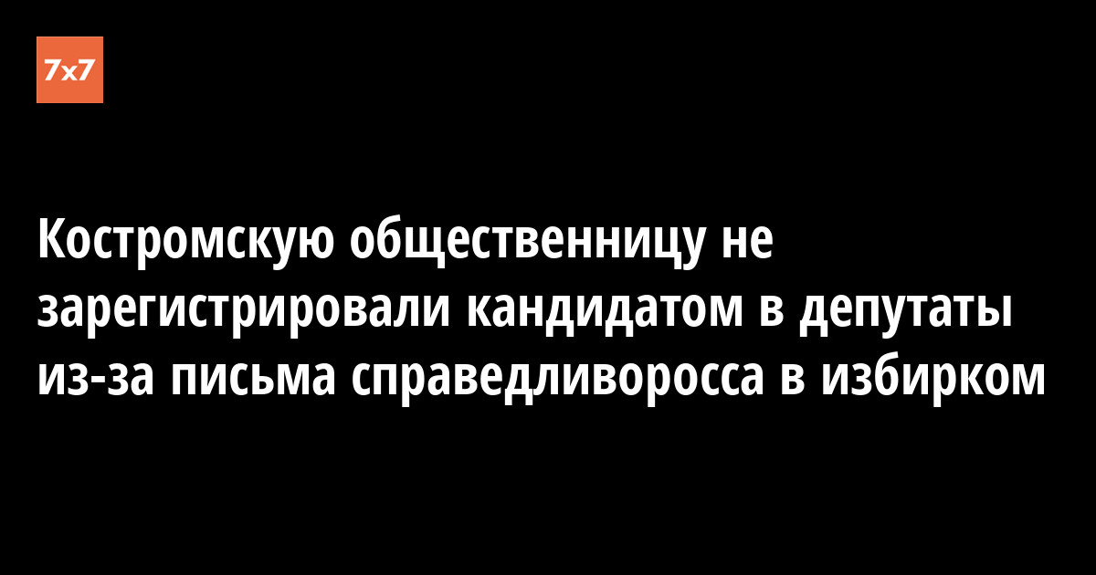 Территориальная избирательная комиссия №1 отказала общественнице Наталье Цветковой в регистрации кандидатом в депутаты гордумы от партии «Яблоко», а региональный избирком исключил ее из заверенного списка кандидатов в депутаты Костромской облдумы, выдвинутых по областному избирательному округу. Об этом 12 августа сообщила сама Цветкова на своей странице в Facebook.