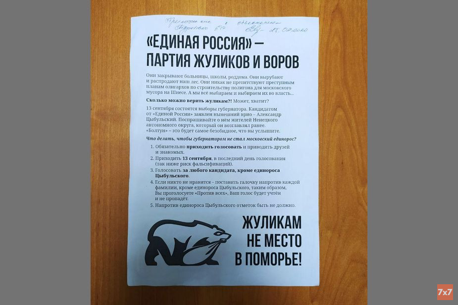 Как рассказал «7х7» юрист «Общественного вердикта» Эрнест Мезак, представляющий интересы Туробовой, о распространении листовок, в которых предлагалось голосовать «за любого кандидата, кроме единоросса Цыбульского», в полицию сообщила местная жительница. При составлении протокола Екатерина признала, что действительно раскладывала в почтовые ящики листовки с агитацией против «Единой России», так как «они [представители партии] закрывают школы, больницы, роддома», «вырубают и распродают наш лес» и «никак не препятствуют преступным планам олигархов по строительству полигона для московского мусора на Шиесе».