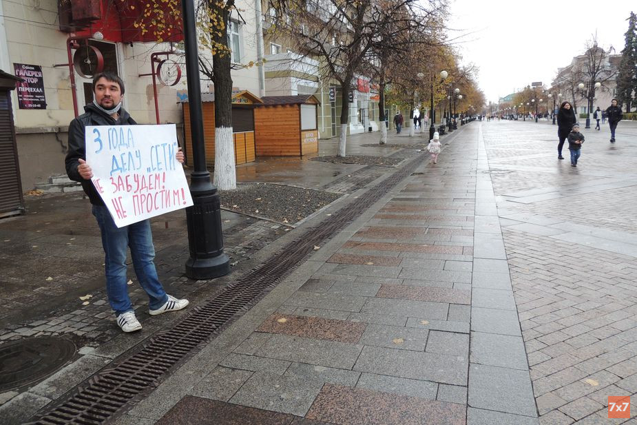 Иван Финогеев вышел на одиночный пикет на улицу Московскую неподалеку от здания УФСБ по Пензенской области. Он держал в руках плакат «Три года делу „Сети“*. Не забудем, не простим!».