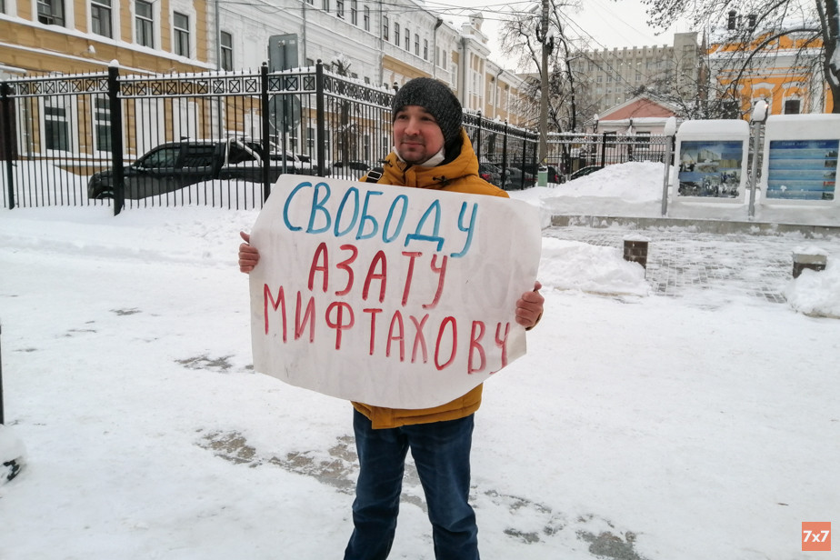Иван Финогеев узнал о приговоре из публикации «7х7», после чего нарисовал плакат «Свободу Азату Мифтахову» и вышел с одиночным пикетом на улицу Московскую в центре Пензы.