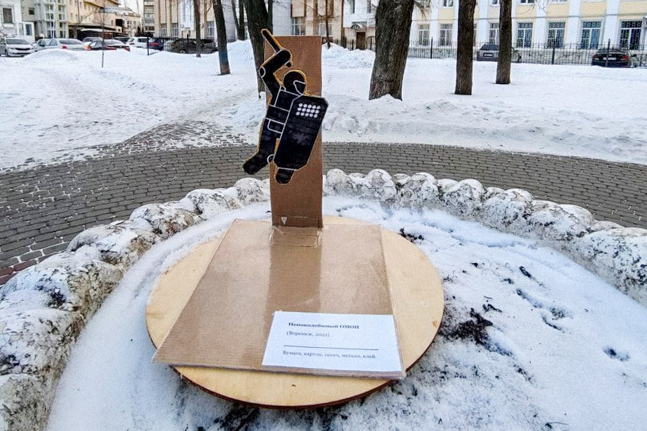 В сквере имени Бунина недалеко от здания Воронежского областного суда 15 февраля неизвестные установили арт-объект, сделанный из картона, под названием «Непоколебимый ОМОН». Авторы, которые пожелали остаться анонимными, хотели обратить внимание общества на масштаб полицейского насилия, который правоохранители проявили на несогласованных акциях 23 и 31 января. Они прислали фото с места установки арт-объекта и описание к нему в редакцию «7x7».