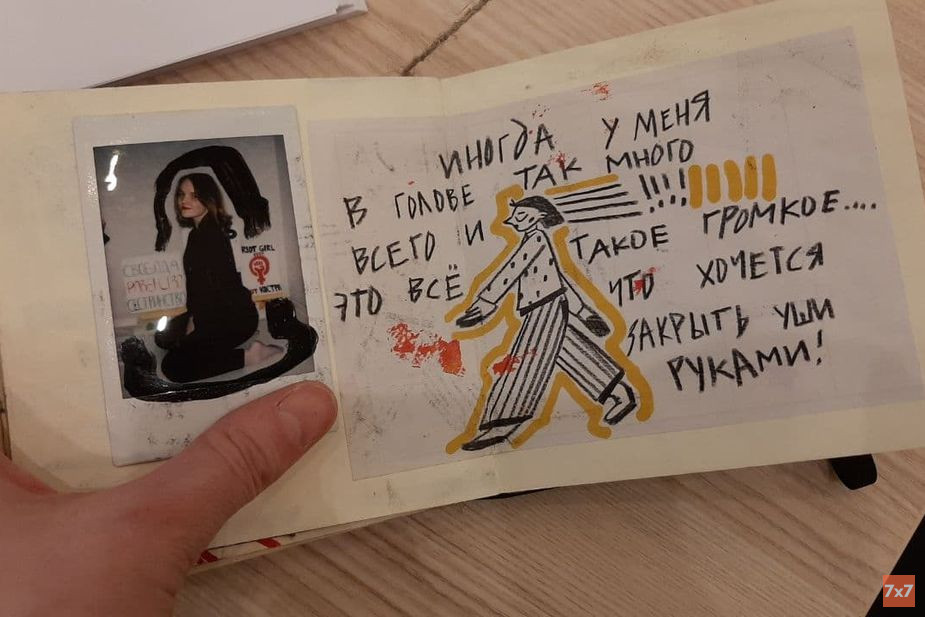 - У Даши нет средств, чтобы рисовать что-то на больших полотнах, - заметила активистка. - У нее более прямая, живая стилистика, более личная. Здесь представлены буквально отсканенные странички из скетчбука, которые она не переносила на мольберты. Такое возможно и так тоже можно выставлять и вести диалог с публикой.