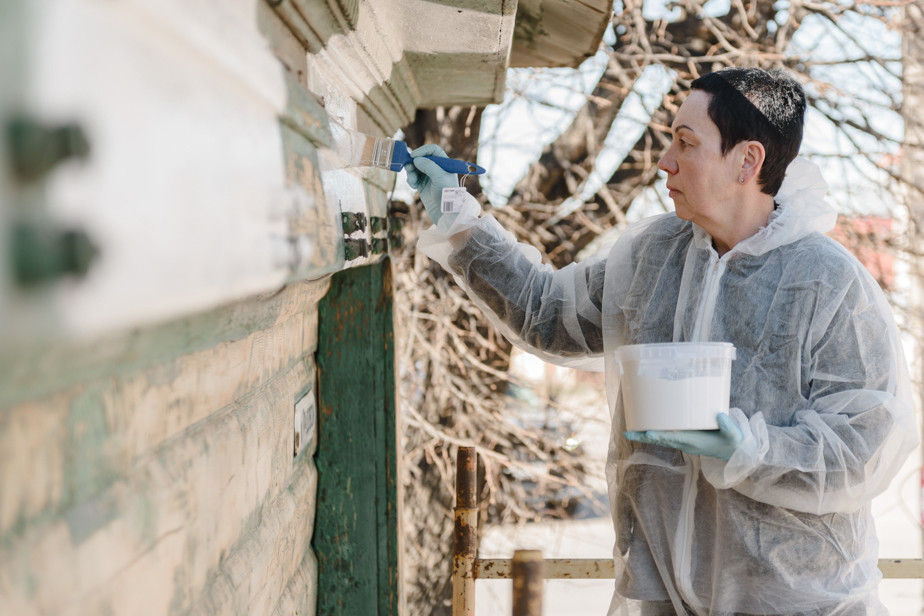 Волонтер красит окна дома №34 на улице Ростовской. Фото Анны Бородиной