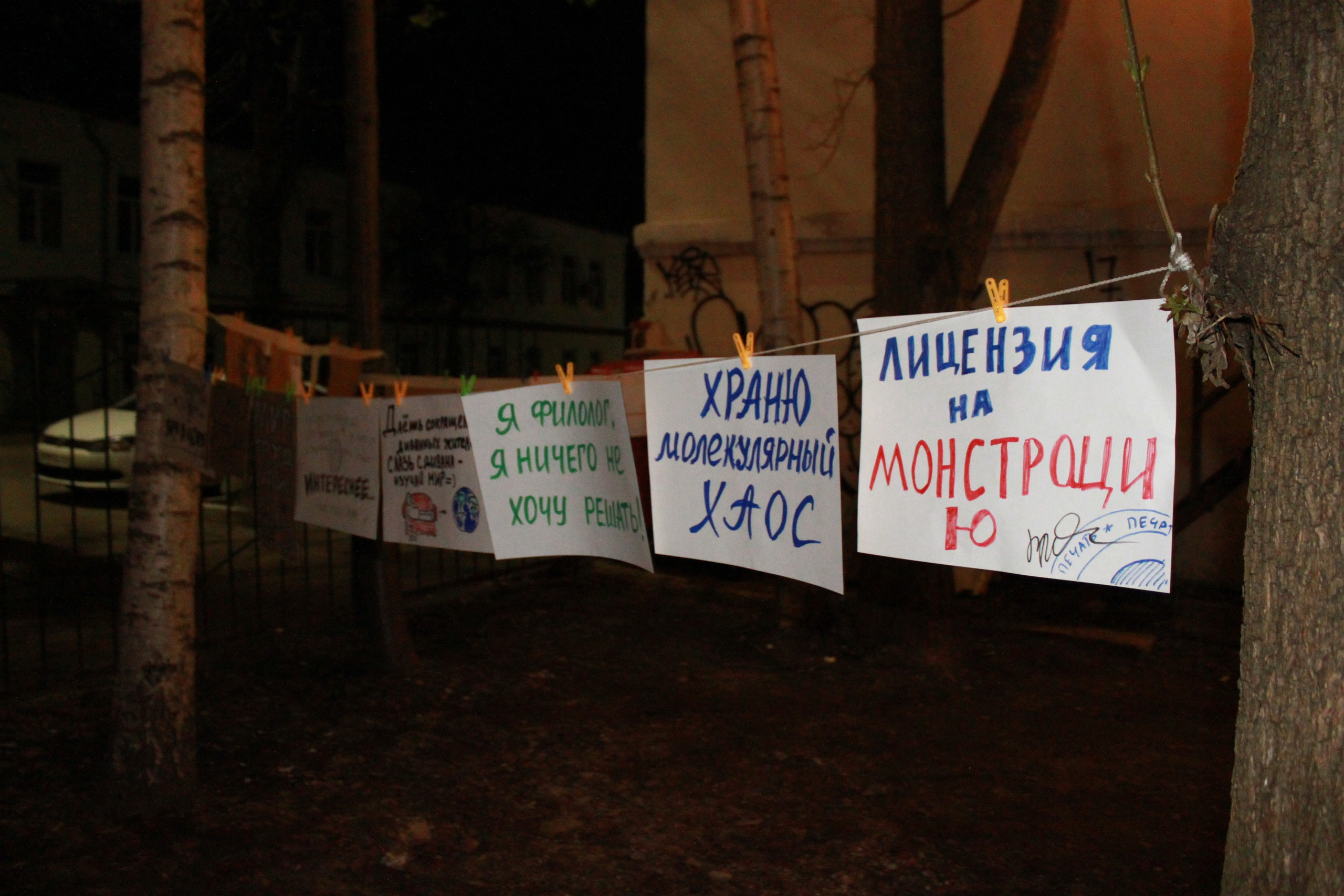 Соорганизатор Наталия Фельдман рассказала участникам о том, что такое Монстрация, желающие нарисовали плакаты с лозунгами «Даешь сокращение диванных жителей! Слазь с дивана — изучай мир», «Я филолог, я ничего не хочу решать», «Храню молекулярный хаос» и другие. Финалом встречи стало шествие по двору.