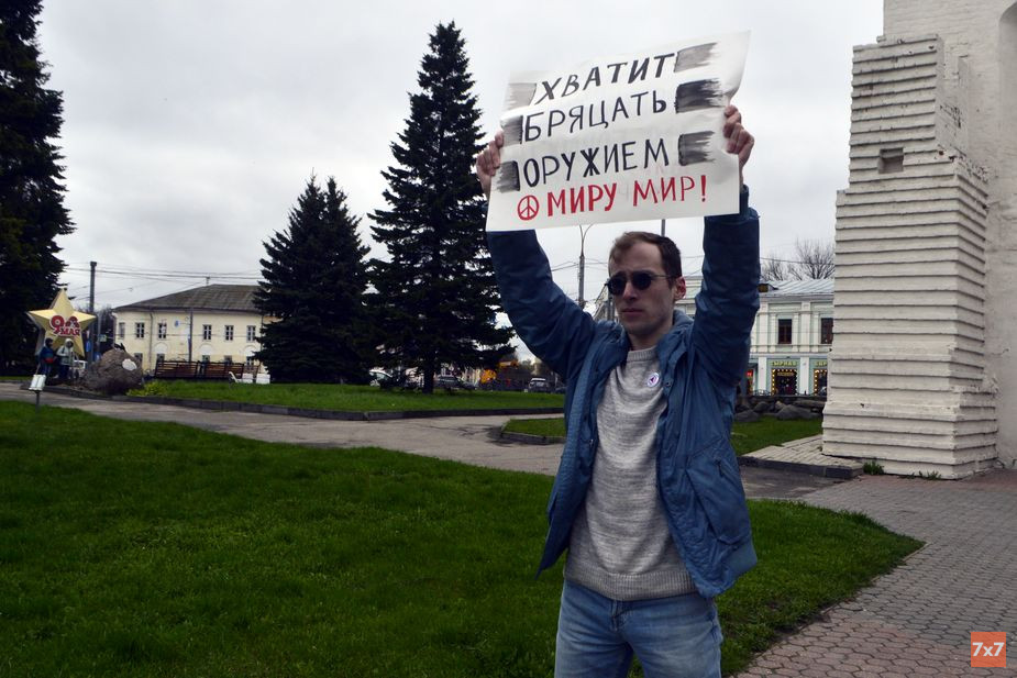 Активист Ярослав Сироткин 9 мая вышел на одиночный пикет к Знаменской башне в центре Ярославля с двусторонним плакатом. На одной стороне было написано «Хватит бряцать оружием. Миру мир!», на другой - «Война - не повод для гордости. Миру мир».