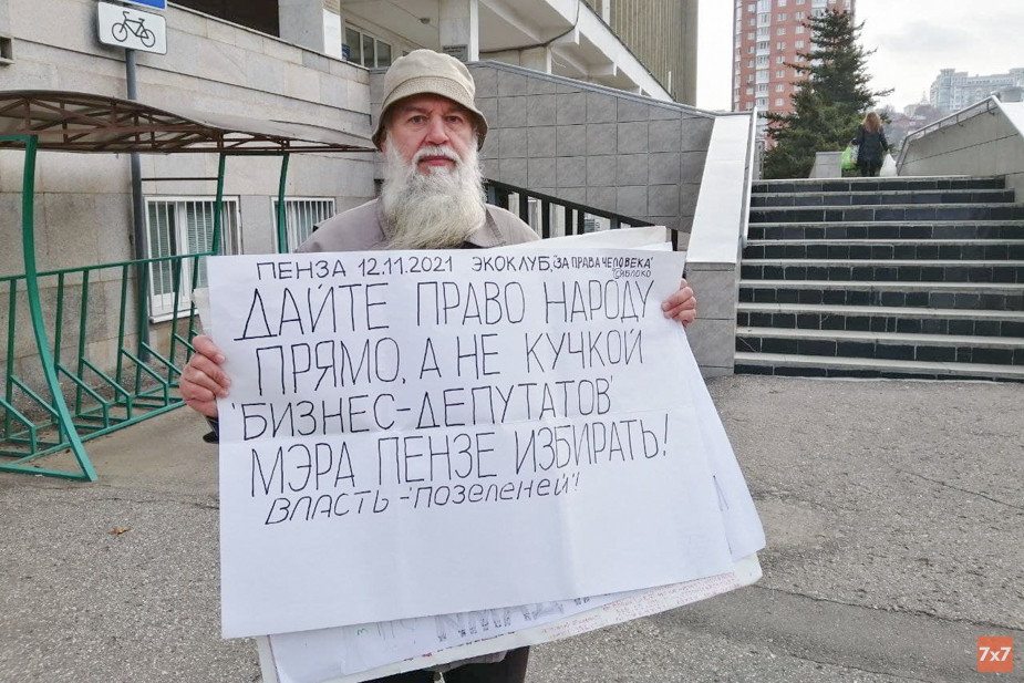 Пензенский активист Юрий Вобликов провел одиночный пикет за возвращение прямых выборов мэра. В этот момент депутаты Пензенской гордумы голосовали за нового главу администрации. Им стал бывший военный Александр Басенко. Вобликов считает, что у людей украли право выбора. Об этом активист рассказал «7х7».