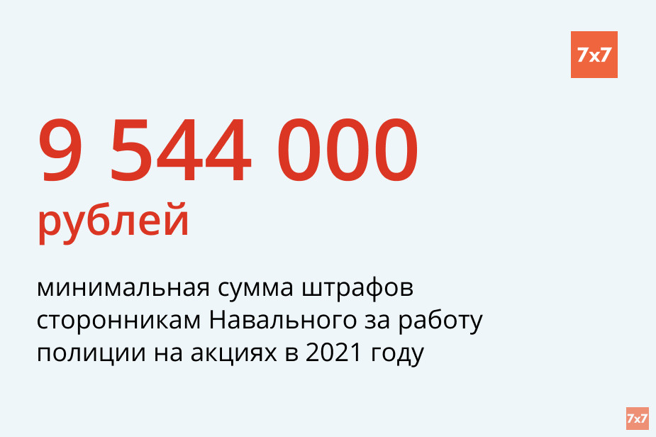 В течение 2021 года силовики подавали иски к организаторам акций в поддержку Алексея Навального за работу на январских и апрельском митингах. Пензенская область стала первым регионом, где полиция потребовала взыскать с организаторов протеста затраты на сверхурочные и бензин. Иски варьировались от 180 тыс. до 4 млн руб. Суды хоть и снижали сумму требований, но выносили решения в пользу полицейских. Интернет-журнал «7х7» посчитал, сколько денег взыскали с активистов за работу УМВД и Росгвардии в регионах России на акциях в поддержку Навального.