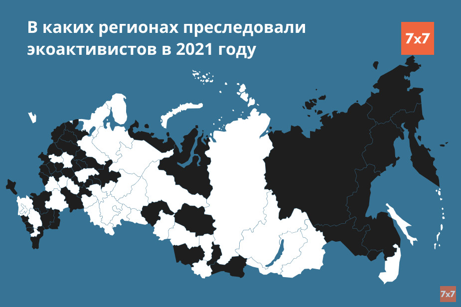 Российский социально-экологический союз зафиксировал 135 случаев давления на 181 экоактивиста в 44 регионах России. На защитников природы нападали неизвестные, Минюст признавал их иностранными агентами, а силовики составляли протоколы об административных правонарушениях и возбуждали уголовные дела. В каких регионах известны случаи преследования экоактивистов — в одной картинке «7x7».