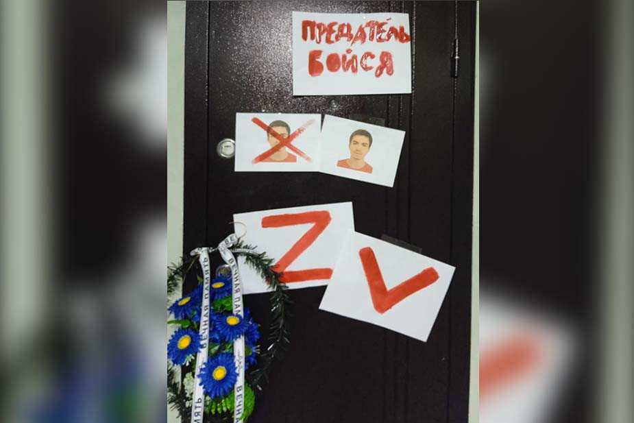 На плакате Кириллу Сухорукову, активисту проекта «Калининград увольняет Путина», неизвестные написали: «Предатель, бойся» — и повесили символы войны в Украине: буквы Z и V. Туда же они наклеили две его фотографии, одну из которых перечеркнули красным крестом. Дверь, увешанную угрозами и похоронным венком, Сухоруков обнаружил, когда вернулся домой.