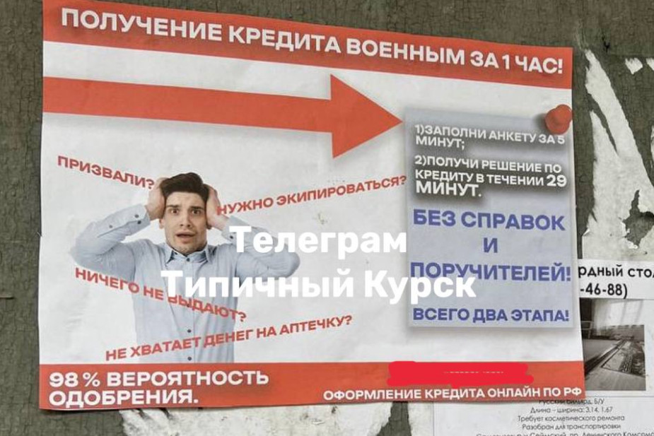 Жительница Курска заметила на подъезде дома рекламу микрофинансовой организации, которая предлагает взять заем на покупку экипировки для участия в войне в Украине. Вероятность одобрения кредита авторы рекламы оценили в 89%.