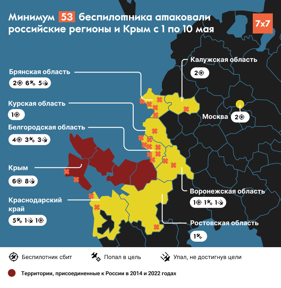 Как минимум 53 дрона ударили по российским регионам и Крыму или были сбиты на этих территориях в первые 10 дней мая. Почему количество атак резко увеличилось и сколько их было в майские праздники в прошлом году — в материале «7x7».