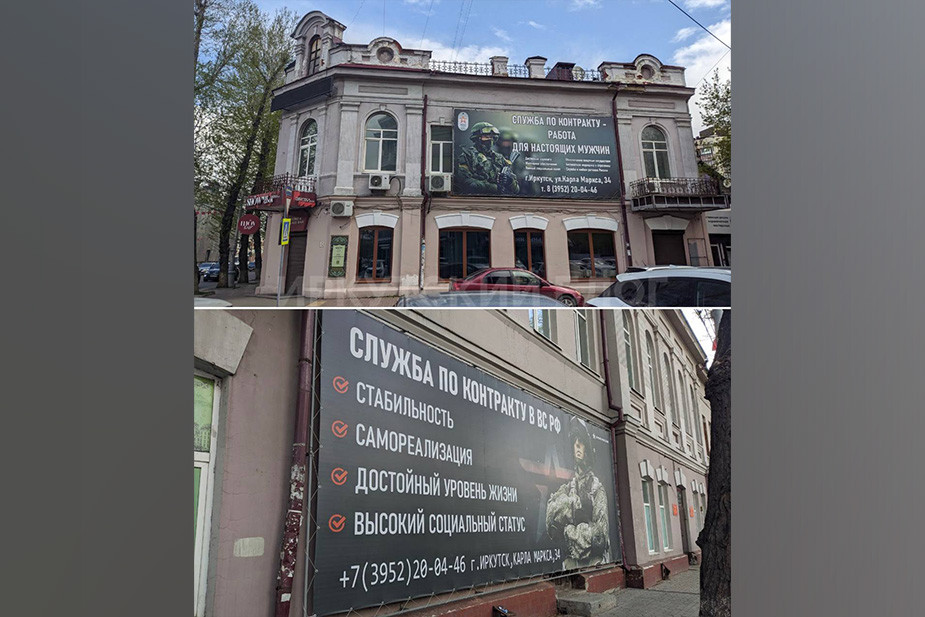 Житель Иркутска попросил чиновников снять рекламу службы по контракту со здания военкомата в зоне исторической застройки. Вице-мэр Татьяна Макарычева не увидела в этом нарушения закона. Об этом 9 июня сообщил телеграм-канал «Иркутский блог».