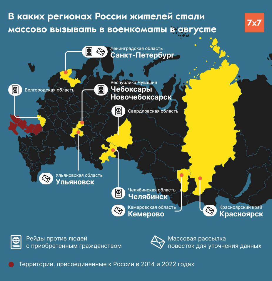 В последний месяц лета стало известно о массовых вызовах мужчин в военкоматы минимум в восьми российских регионах. На людей, которые недавно получили гражданство России и не встали на воинский учет, устраивали целые облавы для отправки их в военкомат. «7х7» составил карту регионов, где это происходило.