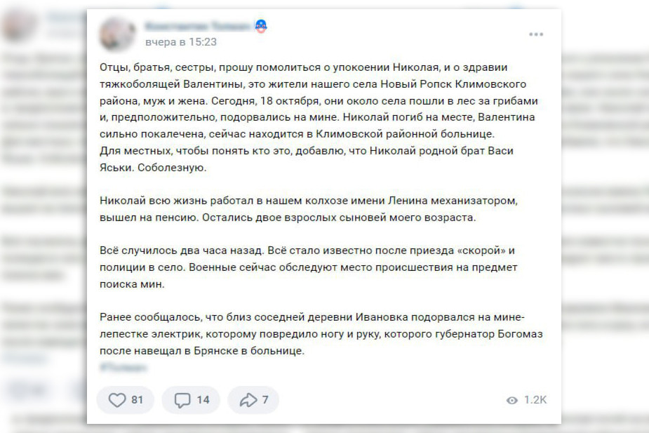 «Стал на мину [Николай], так его разорвало, и ноги поотрывало, и все на свете. У нее телефон был [у Валентины], и она позвонила в скорую, а скорая в милицию. Она ползла. Сознание от страха потеряла. Раньше тоже было: они ходили в лес, набрали грибов и началась стрельба», — рассказала жительница Нового Ропска в соцсети.