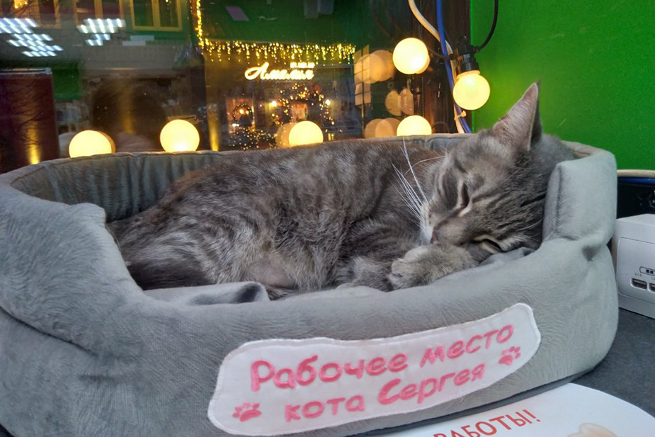 Кот по кличке Сергей жил в магазине «Юмаркет» на Курортном проспекте. Несколько лет назад он прибился в магазин. Сотрудники оборудовали ему лежанку и повесили рядом табличку «Почетный сотрудник».