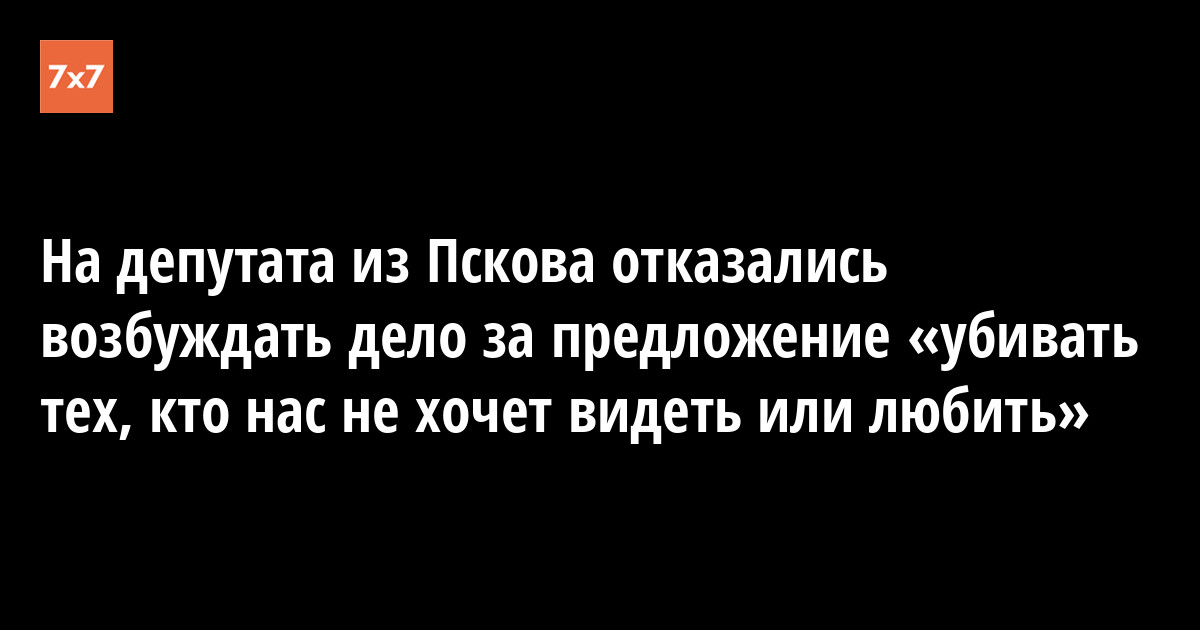 В отношении псковского депутата Армена Мнацаканяна МВД, СК и ФСБ отказались возбуждать уголовное дело. Он публично предложил «убивать тех, кто нас не хочет видеть или любить». Об этом сообщил политик Николай Кузьмин в своем телеграм-канале 25 июля.