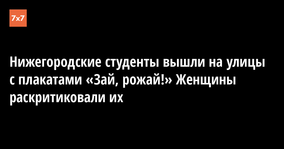 Студенты из Нижнего Новгорода 26 февраля устроили акцию в поддержку мер по повышению демографии. Они вышли на улицы города с табличками «Зай, рожай!». Нижегородки в соцсетях напомнили, что «зайку с зайчонком» нужно обеспечить «лужайкой» — жильем, которое в современной России трудно купить. Они поделились своим мнением в комментариях в группе «Подслушано Нижний Новгород».