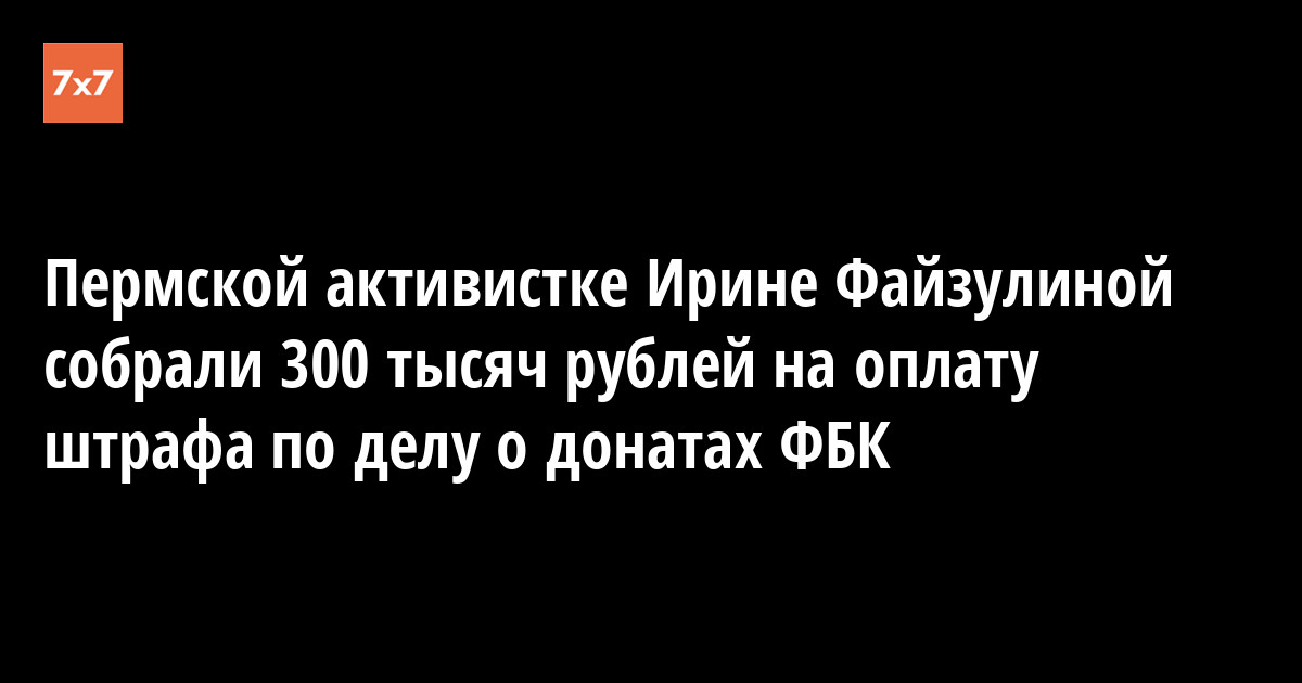 Сочувствующие собрали для активистки Ирины Файзулиной 300 тысяч рублей на оплату штрафа по делу о пожертвованиях ФБК. Об этом сообщил ее супруг и юрист Артем Файзулин.