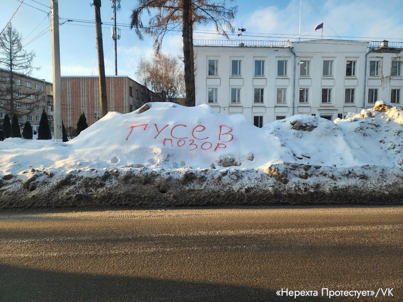 Напротив администрации Нерехтского района на сугробе утром 6 марта появилась надпись «Гусев позор», адресованная главе района, единороссу Роману Гусеву. Фото опубликовали в группе «Нерехта Протестует».
