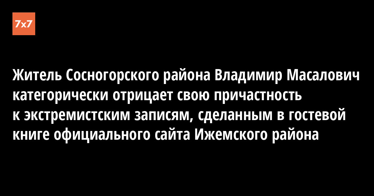 – На самом деле на этот сайт я заходил пару раз, – пояснил он «7x7». – Один раз я только поинтересовался, когда состоится традиционный праздник коми-ижемцев «Луд». И еще как-то поздравил ветеранов в гостевой книге с 9 мая. И зарегистрировался под собственным именем, а не каким-то «Колобком». Про экстремистские записи я узнал от следователей следственного комитета. Там сразу после них кто-то написал, что записи эти сделал Владимир Масалович. И вот на основании этого начались в отношении меня следственные мероприятия.
