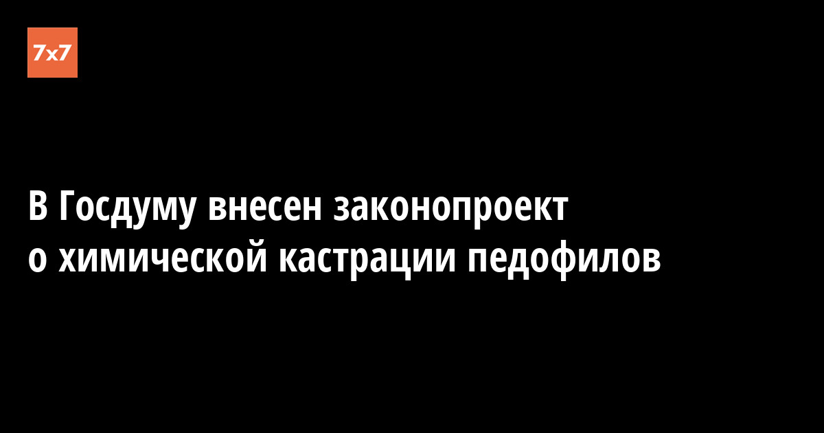В Госдуму внесен законопроект о химической кастрации педофилов, передает "Эхо Москвы". "Согласно предлагаемым изменениям в Уголовный кодекс, химическая кастрация станет одной из мер принудительного медицинского характера, которая будет применяться к лицам, совершившим преступления сексуального характера в отношении детей и готовящимся выйти на свободу после отбывания наказания за данное преступление," - сообщил автор документа, депутат от "Справедливой России" Антон Беляков. В соответствии с законопроектом, первичная процедура химической кастрации будет осуществляться за шесть месяцев до окончания отбывания наказания.