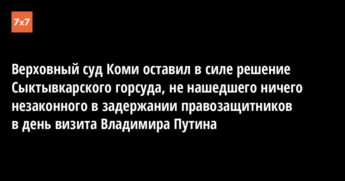 Верховный суд Коми сегодня оставил в силе решение Сыктывкарского суда, 5 мая с.г. отказавшего правозащитникам Александру Островскому и Алексею Семенову в их требовании признать незаконным поведение милиции, выразившееся в их задержании и ограничении прав на свободу передвижений и личную неприкосновенность во время визита в Сыктывкар премьер-министра РФ Владимира Путина.