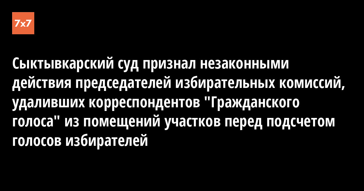 Вчера, 17 октября, Сыктывкарский горсуд удовлетворил требования московского Фонда в поддержку демократии «ГОЛОС» и газеты «Гражданский голос» и признал незаконными действия Территориальной избирательной комиссии (ТИК) Сыктывкара и семи участковых избирательных комиссий города на выборах 13 марта, в результате которых корреспонденты вышеназванной газеты были удалены из помещений комиссий во время подсчета голосов избирателей. Председатели участковых комиссий, давшие показания в суде качестве свидетелей, не стали скрывать того факта, что указание удалить корреспондентов они получили из ТИКа.
